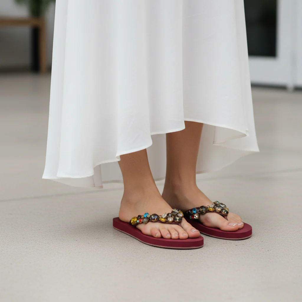 The Grace Up Softie S23 is a stylish and comfortable flip flop enhanced with vibrant colored stones. Made with quality materials, it provides durable support and a pop of color to any outfit. Elevate your summer footwear with this fashionable and functional sandal.